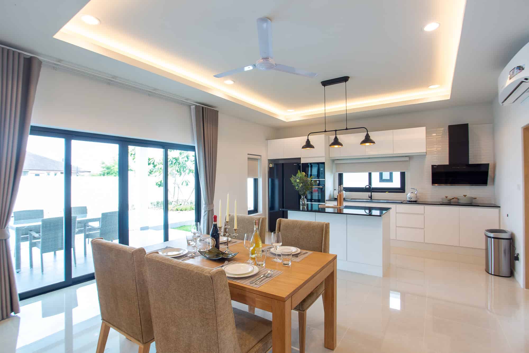 Brand-new 3-bedroom pool villa for sale at Chada Homes Hua Hin, Thailand, featuring a European-style kitchen, fully furnished interiors, and premium modern amenities.